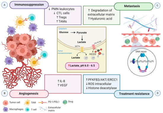 Schematic representation of the impact of hypoxia-associated metabolic reprogramming in tumor progression. The increased production of lactate along with the overexpression of CA-IX and CA-XII are regulated by HIF-1α directly, promoting the acidification of the tumor microenvironment. (A) The acidic microenvironment decreases the proliferation of polymorphonuclear leukocytes and CTL cells and increases the recruitment of Tregs cells. Moreover, the secretion of cytokines and chemokines attracts monocytes, enabling them to differentiate into macrophages or TAMs. TAMs express ligand-receptor PD-L1 that inhibits T cells cytotoxic function, and macrophages induce inflammation. Altogether, these mechanisms generate an immunosuppressive tumor microenvironment. (B) Elevated lactate in the tumor microenvironment boosts IL-8 and VEGF to facilitate angiogenesis. (C) Increased angiogenesis coupled with the acidic tumor microenvironment induces the degradation of the extracellular matrix and the expression of hyaluronic acid, which supports tumor cell migration and metastasis. (D) Lactate efflux activates metabolic substrates and the transcription of genes involved in metabolic rewiring to influence the tumor’s ability to respond to radiotherapy and chemotherapy-induced DNA damage. Increased PFKFB3 improves the ability of DNA repair, and reduced intracellular ROS accumulation increases the tolerance to DNA damage. Moreover, inactivation of histone deacetylase caused by elevated lactate promotes DNA repair. Abbreviations: CA, carbonic anhydrase; CTL, cytotoxic T lymphocytes; IL-8, interleukin 8; PD-1, programmed cell death protein 1; PD-L1, programmed death-ligand1; PFKFB3, 6-phosphofructo-2-kinase/fructose-2,6-biphosphatase 3; PMN, polymorphonuclear leukocytes; ROS, reactive oxygen species; TAMs, tumor-associated macrophages; Tregs, regulatory T cells; VEGF, vascular endothelial growth factor.