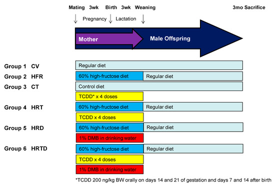 The global consumption of fructose per capita has grown exponentially during the past few decades [1]. A diet high in fructose consumed during pregnancy not only induces adverse effects for mothers, but also for their adult offspring [2,3]. The origins of many adult diseases can be traced to negative experiences early in life. This notion is termed the developmental origins of health and disease (DOHaD) [4]. Our previous study reported that offspring exposed to maternal high-fructose diets developed hypertension in adulthood [5]. Progression of normotensive children to hypertensive adults can occur synergistically with multiple adverse environmental conditions [5]. Exposure to environmental chemicals, such as dioxins, can increase the risk of hypertension [6]. Specifically, maternal 2,3,7,8-tetrachlorodibenzo-p-dioxin (TCDD) exposure has been reported to exacerbate hypertension in adult male offspring in various models of developmental programming [7,8].