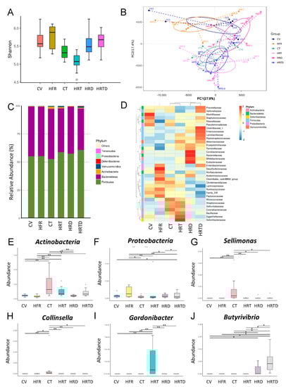 Effects of high-fructose intake, 2,3,7,8-tetrachlorodibenzo-p-dioxin (TCDD) exposure, and 3,3-Dimethyl-1-butanol (DMB) on the gut microbiota in offspring at 12 weeks of age. (A) α-diversity was represented by the Shannon’s indexes. (B) β-diversity changes in gut microbiota across groups were shown by principal component analysis (PCA). (C) Relative abundance of the top 10 phyla of the gut microbiota among the six groups. (D) Heat map of the 16S rRNA gene sequencing analysis of the gut microbiome at the family level. The abundance of (E) phylum Actinobacteria, (F) phylum Proteobacteria, (G) genus Sellimonas, (H) genus Collinsella, (I) genus Gordonibacter, and (J) genus Butyrivibrio among the six groups. CV = control rats received regular diet and vehicle; HFR = rats received high-fructose diet; CT = rats received regular diet and TCDD exposure; HRT = rats received high-fructose diet and TCDD exposure; HRD = rats received high-fructose diet and DMB treatment; HRDT = rats received high-fructose diet, TCDD exposure, and DMB treatment. * p < 0.05. ** p < 0.01.