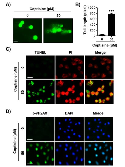 In order to evaluate the effect of coptisine on apoptotic DNA damage, comet assay, terminal deoxynucleotidyl transferase-mediated dUTP-biotin nick end labeling (TUNEL) assay, and immunofluorescence analysis of phospho-H2A histone family member X (p-γH2AX) were performed. Figure 2A shows that the coptisine-treated cells demonstrated a smeared pattern of nuclear DNA with a comet tail, but control cells did not. As shown in Figure 2B, the tail length was increased by about 15.89 times as compared with the control group. In addition, we found that treatment of coptisine increased the population of TUNEL positive cells (Figure 2C) and phosphorylation of γH2AX, a marker for DNA damage was upregulated (Figure 2D).