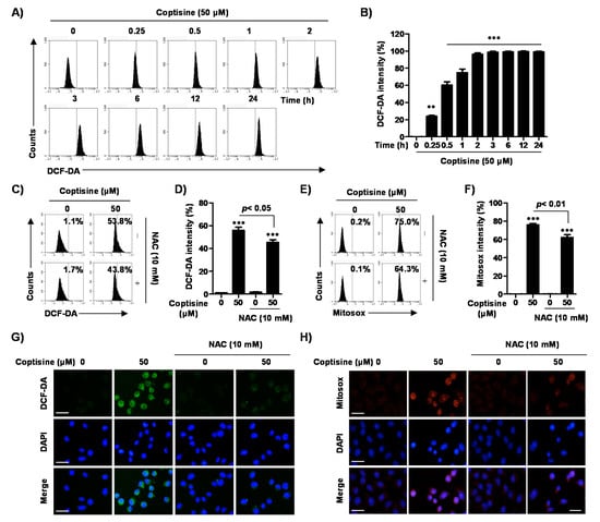 To evaluate the coptisine-induced apoptosis due to the oxidative stress in Hep3B cells, we measured ROS generation by flow cytometric analysis. Figure 5A,B shows that coptisine significantly increased ROS generation from 15 min (22.53%) after treatment, and then maintained ROS levels for 24 h (97.84%). Therefore, the source of ROS generation by coptisine was reconfirmed, and we evaluated if the cytotoxic effect of coptisine was dependent on ROS. Our results showed that coptisine elevated the levels of intracellular ROS as well as mitochondrial ROS, which were identified by MitoSOX™ red staining, but the increase was markedly suppressed by N-acetylcysteine (NAC), a ROS scavenger (Figure 5C–F). In addition, the results of flow cytometry were consistent with that of fluorescence microscopy observation (Figure 5G,H).