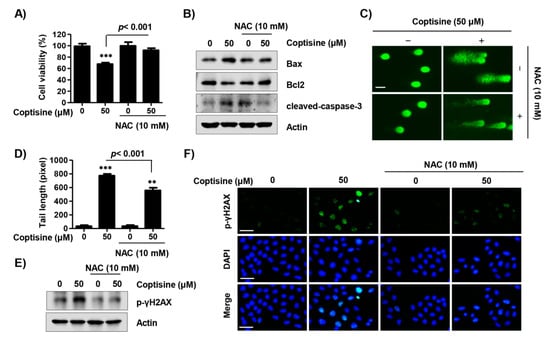 On the basis of the result that coptisine induced ROS production, we assessed whether coptisine-mediated apoptosis was either dependent on, or independent of ROS in Hep3B cells. Our findings showed that pretreatment of NAC significantly restored the reduced survival rate by coptisine to the control level (Figure 6A). In addition, upregulation of the expression of Bax and cleaved-caspase-3 in coptisine-treated cells were suppressed by NAC (Figure 6B). Moreover, NAC substantially inhibited the comet tail length (Figure 6C,D) and overexpression of p-γH2AX by coptisine (Figure 6E,F).