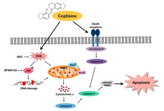 In summary, the present study has demonstrated that coptisine exerts antitumor effects in Hep3B cells through induction of extrinsic and intrinsic apoptosis pathways. Coptisine induces ROS-dependent apoptosis by targeting JNK signaling pathway, DNA damage, and mitochondrial dysfunction (Figure 8). Taken together, the ability of coptisine provides information for understand the mechanism relevant to ROS in HCC cells death.