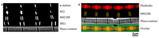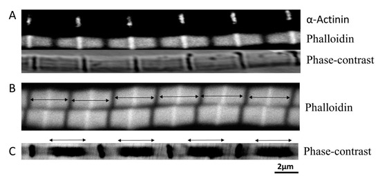 - Luther, P.K.; Padrón, R.; Ritter, S.; Craig, R.; Squire, J.M. Heterogeneity of Z-band structure within a single muscle sarcomere: Implications for sarcomere assembly. J. Mol. Biol. 2003, 332, 161–169. [Google Scholar] [CrossRef]