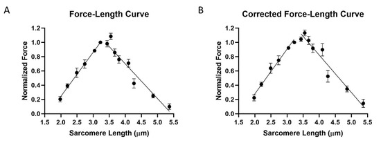 Knowing that the descending limb possibly contains points from damaged fibers, the steep slope shown in Figure 3A could be from the damaged fibers generating less force than if the fiber were undamaged. In other words, if the sarcomere structure remained intact at long sarcomere lengths, the slope of descending limb should be less steep than what have shown here, and the thin-thick filament overlap would be abolished at a sarcomere length that is longer than 5.34 μm (Figure 3A). To test this hypothesis, we applied a correction to the data values assuming that the rundown is a linear function of the number of contractions. The corrected curve (Figure 3B) retains the same shape as the uncorrected curve but is less steep and less narrow (Figure 3A). The sarcomere length that abolished thin-thick filament overlap also increased to 5.49 μm. We speculate that 5.49 μm is closer to the true value for the zero-force intercept of the extrapolated line for the descending limb if the fibers remained intact.