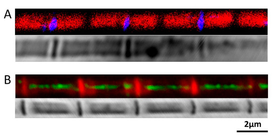 The MAC150 antibody was used to label the fragments inbetween the N and the C-termini of projectin. While the location of the MAC150 epitope on projectin has not yet been precisely mapped, it has been used to identify projectin in Lethocerus [31] and Drosophila [32]. In mildly stretched myofibrils, the signals of MAC150 are located immediately next to the Z-band (Figure 4A,B), and overlap with the I-bands on either side of the Z-band (Figure 4B, yellow). To further demonstrate that MAC150 targets fragments of projectin in the I-band, we stretched the myofibril to a longer sarcomere length (3.9 μm). The results showed that at short sarcomere length (3.1 μm), the two stripes were close together, and the two stripes gradually move away from each other as the myofibril is stretched to longer sarcomere length. The position of the 3B11 epitope is located at the C-terminus of the projectin molecule [27]. While the 3B11 fluorescent signals were also observed next to the Z-band, they were further away from the Z-band compared to the MAC150 signals at slack length (Figure 4A).