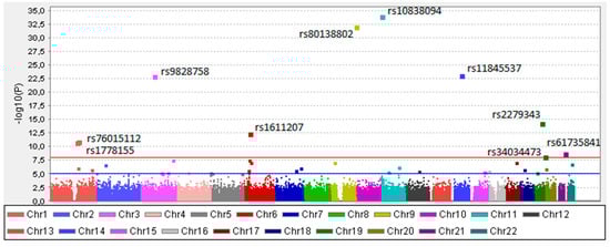 The “Manhattan” plot for the genome-wide association study of all analyzed mastocytosis patients. On the x-axis, each color represents different chromosomes. The log10 of the unadjusted p-values (without multiple testing corrections) are shown at the y-axis. The blue line indicates the suggestive association threshold (10−5), while red line indicates GWAS significant threshold (10−8).