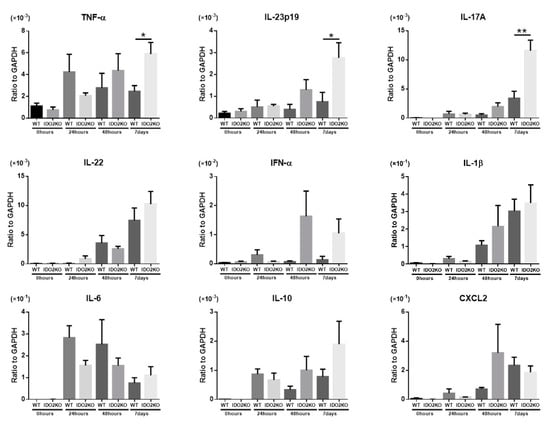 We determined the mRNA expression levels of several inflammatory cytokines that are important in psoriasis (TNF-α, IL-23p19, IL-17A, IL-22, IFN-α, IL-1β, IL-6, and IL-10) and a chemokine that promotes the migration of neutrophils (CXCL2) using quantitative real-time PCR [,,]. Since the peak-time of activity is different for each cytokine, we measured the mRNA levels of cytokines in the ear skin of WT and IDO2 KO mice before and 24 h, 48 h, and 7 days after IMQ treatment (Figure 3). Cytokine mRNA levels were not significantly different between WT and IDO2 KO mice before and 24 h after IMQ treatment. However, 48 h and 7 days after IMQ treatment, the mRNA levels of most key cytokines involved in psoriasis development were higher in IDO2 KO than in WT mice. Furthermore, the expression of TNF-α, IL-23p19, and IL-17A was significantly higher in IDO2 KO than in WT mice on day 7. Thus, these results show that the deletion of IDO2 affects the mRNA expression of key cytokines for the pathogenesis of psoriasis.