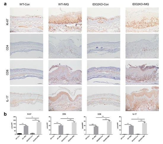 We next examined the immunohistological differences between WT and IDO2 KO mice treated with IMQ or vehicle after 7 days. Firstly, to assess keratinocyte proliferation in the ear skin of mice, we stained for Ki-67, a cell proliferation marker (Figure 4a,b). We counted the number of Ki-67-positive cells in the epidermis per high power field. Treatment with IMQ significantly increased the number of Ki-67-positive cells in WT and IDO2 KO mice. In addition, the number of Ki-67-positive cells was significantly higher in IMQ-treated IDO2 KO mice than WT mice. Secondly, to test T cell infiltration in the dermis, we investigated the expression of CD4 and CD8, which are the markers of helper and cytotoxic T cells, respectively (Figure 4a,b). We counted the number of CD4- or CD8-positive cells in the dermis per high power field. IMQ treatment significantly increased the number of CD4- or CD8-positive cells in WT and IDO2 KO mice. The number was significantly higher in IMQ-treated IDO2 KO than WT mice. Finally, because IL-17 signaling plays an important role in psoriasis [,,], we counted the number of IL-17-positive cells in the dermis per high power field (Figure 4a,b). Similarly, the number of IL-17-positive cells in WT and IDO2 KO mice receiving IMQ treatment was significantly higher compared to mice receiving vehicle. Moreover, we found a significantly greater number of IL-17-positive cells in IMQ-treated IDO2 KO mice than WT mice. Therefore, these results show that keratinocyte proliferation and infiltration of inflammatory cells were significantly induced in IDO2 KO mice treated with IMQ, and IMQ-induced psoriasis-like dermatitis is induced in IDO2 KO mice via IL-17-positive lymphocytes.