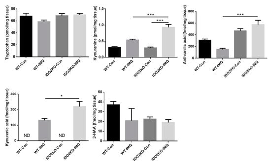 To elucidate the mechanism by which IDO2 deficiency exacerbates IMQ-induced psoriasis-like skin inflammation, we next measured the concentration of tryptophan metabolites, including tryptophan, kynurenine, kynurenic acid, anthranilic acid, and 3-hydroxy anthranilic acid (3-HAA), in the ears of WT and IDO2 KO mice treated with vehicle or IMQ for 7 days, using high performance liquid chromatography (HPLC). Although it is generally considered that the concentration of kynurenine decreases upon deletion of IDO2 gene, unexpectedly, it did not decrease in IDO2 KO mice compared to WT mice. Moreover, tryptophan metabolites (kynurenine, kynurenic acid and anthranilic acid) were found in higher concentrations in IMQ-treated IDO2 KO mice than WT mice (Figure 5). Kynurenine is known to actively suppress the immune system by binding to the aryl hydrocarbon receptor, thereby inducing regulatory T cells [,]. Kynurenic acid also suppresses the production of IL-17 and IL-23 in CD4+ T cells and dendritic cells in vitro []. Thus, the accumulation of kynurenine and kynurenic acid is associated with severe inflammation, resulting in an increase in the downstream metabolites of kynurenine, kynurenic acid, and anthranilic acid. These results show that exacerbation of IMQ-induced psoriasis-like skin inflammation in IDO2 KO mice might be associated with IDO2 itself rather than with tryptophan metabolites.