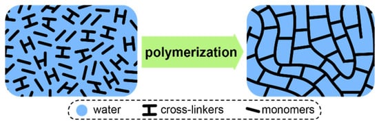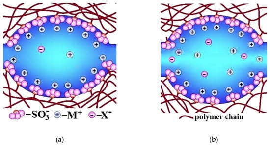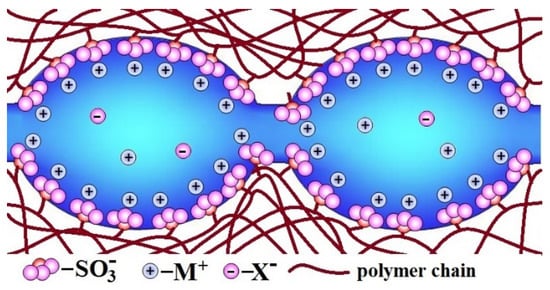 At this point, it is also worth considering IEMs based on strongly cross-linked matrices obtained by polymerization of aqueous or amide solutions of ionogenic monomers, such as functionalized acrylamides or styrenes [151,166,167,168]. Well known Fujifilm ion-exchange membranes also belong to this class of materials [104,169]. Due to the high cross-linker content, reaching 60%, a three-dimensional network is formed during the polymerization, which does not swell like ordinary membranes. Therefore, the maximum water uptake of such membranes is limited by the initial solvent volume, which determines the free volume (Figure 5). However, the hydration degree of such membranes is usually more than 18–20 water molecules per one functional group, due to the limited solubility of the monomers and cross-linkers in the reaction mixture. Of course, this to some extent limits the selectivity of such materials. Note that this approach leads to a paradoxical for other types of ion-exchange membranes effect—an increase in the functional group concentration in these membranes leads to a decrease in water uptake per functional group and an increase in selectivity [168,170,171].