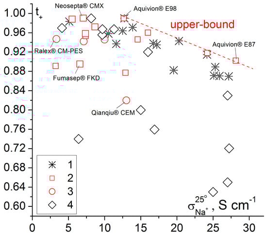 Dependence of apparent transport numbers (0.5/0.1 M NaCl) on the Na+ conductivity of various cation exchange membranes. 1—grafted membranes based on UV-oxidized polymethylpentene [84], 2—homogeneous and pseudo-homogeneous materials, 3—heterogeneous membranes, 4—grafted membranes based on polyethylene [115,132]. Some trade names of commercially available membranes are shown in the Figure.