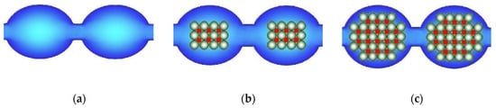 In the case of ion-exchange membranes, this approach is more often used to increase their ionic conductivity. For this purpose, nanoparticles of hydrophilic materials, such as silica [180,181,182,183,184,185,186,187], or other oxides [188,189,190,191,192,193,194,195,196,197,198,199] are used. This often leads to an increase in the membrane water uptake, and therefore it is often believed to be the reason for the conductivity increase. However, in a number of hybrid membranes, the conductivity increases despite the lower water uptake. To explain this effect, a model of limited elasticity of the membrane pore walls was proposed [200]. Upon doping, inorganic nanoparticles should displace a part of water molecules from the pore. Since the counterion concentration remains almost the same, this leads to an increase in the osmotic pressure and a pore expansion (Figure 6a,b), accompanied by an expansion of the channels connecting them and, hence, a conductivity increase. However, with increasing nanoparticle size, the elastic forces of the pore walls increase according to Hooke′s law and the osmotic pressure becomes insufficient for their further expansion. Therefore, the membrane water uptake decreases, and new “bottlenecks” that limit conductivity appear in the pores (Figure 6c). When the additive content is above two vol %, the conductivity of the hybrid membranes decreases [180,201,202,203]. This model is confirmed by comparing the data on the ionic conductivity of hybrid membranes with the diffusion coefficients of proton-containing groups determined by NMR with a pulsed magnetic field gradient [201,204]. The authors of [205] developed this model and described with its help the effect of a double electric layer formed around nanoparticles embedded in mesopores and macropores on the electrical conductivity, diffusion permeability of IEMs, and ion transport numbers in them.