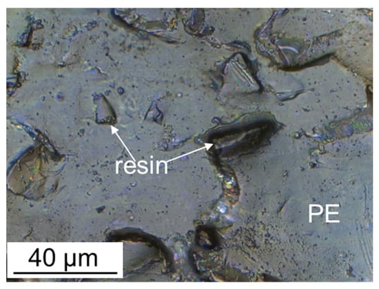 Optical image of the surface of the swollen MA-41 heterogeneous membrane; ′′PE′′ is the polyethylene binder, ′′resin′′ is the ion-exchange resin particle protruding over the polyethylene film (redrawn from [36]).