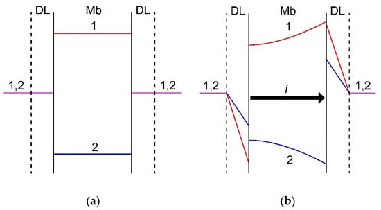To understand the effect of the value of driving force on the membrane specific permselectivity, it is necessary to take into account the current-induced concentration polarization of IEMs in mixed solutions. Mathematical modeling of ion transfer through IEMs in a mixture of several electrolytes was considered in a number of studies [330,332,338,339,340]. For the first time, the dependence of the effective transport numbers of competing ions in a membrane system on the current density was described by Oren and Litan [338]. The authors used the Nernst-Planck equations and the electroneutrality condition written for three types of ions in the membrane and in the diffusion layers adjacent to it. Both diffusion and migration contributions to the ion transport were taken into account in the diffusion layers, and only ion migration in the membrane. A similar model was developed in [330], where both migration and diffusion transport in the membrane were accounted for. It was shown [316,340] that the loss of specific selectivity with increasing current is due to the transition of mass transfer control from the membrane at low currents to the depleted diffusion layer at the currents close to the limiting one. At low currents, the external concentration polarization (deviations of the concentrations from equilibrium in the diffusion layers) is insignificant, and the effective transport numbers of ions are determined by their migration transport numbers in the membrane. With increasing current, the ion concentration in the diffusion layers changes in such a way that the concentration of the selectively transferred counterion (marked as ion 1 in Figure 8) in the depleted diffusion layer decreases much more than the concentration of the competing counterion (ion 2 in Figure 8). Symmetrically, in the enriched diffusion layer, the concentration of the selectively transferred counterion 1 increases more strongly than that of its competitor. As a result, the concentration profiles in the membrane are arranged in such a way that the diffusion flux of the selectively transported counterion is directed opposite to the migration flux, and the diffusion flux of its competitor, on the contrary, is aligned with the migration flux (Figure 8). As a result, concentration polarization, developing with increasing current, restricts the resulting flux of the preferentially transported counterion, and enhances the flux of the competing counterion.