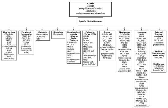 Ataxia is usually part of a complex phenotype in inherited metabolic disorders. There are several important features and signs to point towards inherited metabolic disorders (Figure 1). In medical history, the presence of recurrent somnolence and coma episodes during intercurrent illnesses, a history of protein aversion or failure to thrive, a history of progressive loss of skills, hearing loss, hair abnormalities, behavioral problems, and seizures in combination with ataxia and global developmental delay can guide physicians to consider inherited metabolic disorders in their differential diagnosis. In family history, global developmental delay, cognitive dysfunction, psychiatric disorders, recurrent miscarriage, sudden infant death syndrome, and congenital malformations in other family members can be important clues to consider inherited metabolic disorders in the differential diagnosis. Some of the clinical features together with ataxia can suggest inherited metabolic disorders such as hepatosplenomegaly (lysosomal storage disorders), cardiomyopathy (lysosomal storage disorders, mitochondrial disorders, congenital disorders of glycosylation (CDG)), complex movement disorders (mitochondrial disorders, organic acidurias, neurotransmitter disorders), macrocephaly (Canavan disease, lysosomal storage disorders), or microcephaly (glucose transporter 1 (GLUT1) deficiency, neuronal ceroid lipofuscinosis ((NCL)). To investigate the underlying causes, detailed medical history, family history, and physical examination are important to obtain.