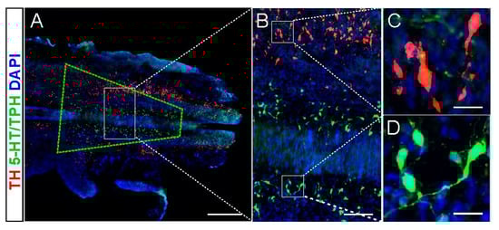 A representative section of the embryonic brainstem with the region of the tissue taken for grafting marked with green quadrangle (A). Selected areas are presented with higher magnifications (B–D). An example of 5-HT neurons (5-HT/TPH-positive; green) in the B1/B2/B3 groups (D) and in close lateral proximity NA neurons (TH positive; red) in the AC1/AC2/AC3 groups (C). For nucleic acid staining, DAPI was used (blue). Scalebars: 500 µm (A); 100 µm (B); 20 µm (C,D). Abbreviations: 5-HT: serotonin; TPH: tryptophan hydroxylase; TH: tyrosine hydroxylase DAPI:4′,6-diamidino-2-phenylindole.