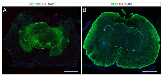 Representative immunofluorescent staining of two cross-sections from the same rat (about 180 µm apart) demonstrating the integration of the grafted tissue into the host spinal cord. (A) The location of the grafted tissue (marked by a dashed line) was estimated by the presence of 5-HT/TPH (green) positive neurons, their fibers, and EdU positive nuclei present exclusively in the cells of embryonic origin (red). Please note that several 5-HT/TPH-positive neurons are located close to the graft border and that there is the robust serotonergic fiber innervation of the spinal cord areas outside the graft region (i.e., the ventral horns). (B) There were no reactive astrocytes detected at the edge of the graft region (GFAP; green). Scalebars: 500 µm. Abbreviations: 5-HT: serotonin; TPH: tryptophan hydroxylase; EdU: 5-ethynyl-2-deoxyuridine; DAPI: 4′,6-diamidino-2-phenylindole; GFAP: glial fibrillary acidic protein.