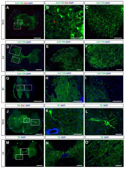 The 5-HT (A–I) and NA (J–O) neurons of graft origin and their axons innervating host spinal cord structures. Representative cross-section of the spinal cord at the epicenter of the graft (approximately the Th13 spinal segment) with serotonergic neurons (A; 5-HT/TPH-positive, green) and the graft area under higher magnification (B). Serotonergic fibers are present in the ventral horn (under higher magnification in C) and in the spinal cord cross-section located at the L3 lumbar spinal cord segment (D) as well as in the dorsal horn (E) and in the ventral horn (F) of spinal cord cross-section illustrated in D. The 5-HT fibers were found as far as 20 mm from the epicenter of the graft (presented in A) caudally in the S1 (proximately) host spinal cord (G–I). Noradrenergic (NA; TH positive, green) neurons and fibers are present in the epicenter of the graft (approximately the Th13 spinal segment) (J) and example of NA neuron (K) as well as NA fibers in the intermediolateral zone (L). NA fibers are present in the cross-section of the L3 lumbar spinal cord level (M) and under higher magnification in the area of the central canal (N) as well as in the ventral horn, however rather sparsely (O). For nucleic acid staining, DAPI was used (blue). Please note that there are no EdU (red) positive serotonergic or noradrenergic neurons in the graft region, confirming that these neurons were already postmitotic at the time of harvesting for grafting from the E14 embryo. Scalebars: 500 µm (A,D,G,J,M); 100 µm (B,C,E,F,H,I,K,L,N,O). Abbreviations: 5-HT: serotonin; TPH: tryptophan hydroxylase; TH: tyrosine hydroxylase; EdU: 5-ethynyl-2-deoxyuridine; DAPI: 4′,6-diamidino-2-phenylindole; Th13, L3, S1: the thoracic 13, lumbar 3, and sacral 1 spinal cord segments.