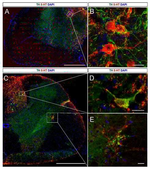 The 5-HT and NA neurons surrounded by each other’s axons identified in the graft vicinity in the host spinal cord of grafted rats. (A) an example of the graft area with 5-HT neurons (red) and NA (green) fibers on the cell membrane; (B) an example of selected neurons under higher magnification in the confocal image; (C) the graft area with 5-HT (red) and NA neurons (green); (D) an example of a selected neuron with 5-HT fibers on the cell membrane under higher magnification in the fluorescent image; (E) the intermediolateral zone rich 5-HT/NA innervation of graft origin under higher magnification in the fluorescent image. For nucleic acid staining, DAPI was used (blue). Scalebars: 500 µm (A,C); 20 µm (B,D,E). Abbreviations: 5-HT: serotonin; TPH: tryptophan hydroxylase; TH: tyrosine hydroxylase DAPI: 4′,6-diamidino-2-phenylindole.
