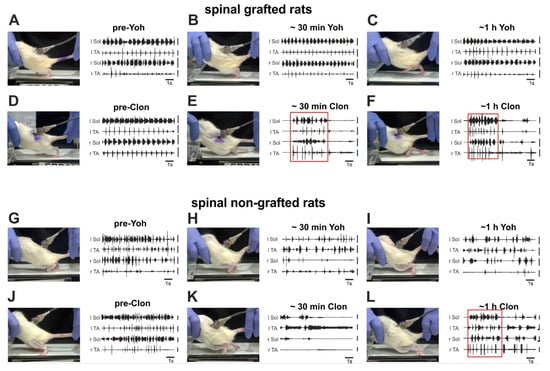 The top two panels present video frames of the spinal grafted rats with a typical posture and accompanied EMG activity recorded during the locomotor performance on the treadmill (A–F) before and after application of yohimbine (antagonist of α2 adrenergic receptors) that substantially improved locomotor hindlimb movements (A–C); before and after application of clonidine (agonist of α2 adrenergic receptors) resulting in deterioration of body weight support and both hindlimbs dragging over the moving treadmill belt (D–F). The bottom two panels (G–L) present video frames of the spinal non-grafted rats with a typical posture and accompanied EMG activity recorded during the locomotor performance on the treadmill before and after application of yohimbine (G–I) that was not accompanied by any visible changes in limb performance and before and after application of clonidine (J–L) resulting in substantial deterioration of already limited limb movements. Abbreviations: l: left; r: right; Sol: soleus muscle; TA: tibialis anterior muscle; ~30 min: about 30 min (short time) after drug application; ~1 h: about 1 h (long time) after drug application; Clon: clonidine; Yoh: yohimbine.