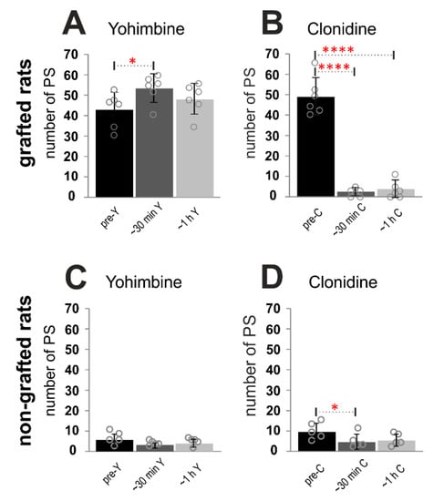 Number of proper plantar steps (PS) in 40 s test of the locomotor performance induced by tail pinching of spinal grafted (n = 6) rats (A,B) and spinal non-grafted (n = 5) rats (C,D) on the treadmill (10 cm/s) before and after application of yohimbine (A,C) or clonidine (B,D). The bars represent means ± SD established for the two groups animals (with and without a graft) in various experimental conditions, while gray circles present the data from individual rats. RM ANOVA with Tukey’s multiple comparisons test: * p < 0.05; **** p < 0.0001. ~30 min: < 30 min after drug application; ~1 h: one hour after drug application; C: clonidine; Y: yohimbine.