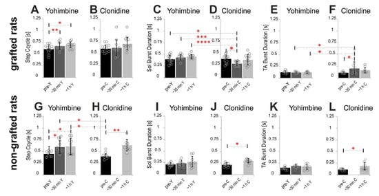 The cycle duration and EMG burst duration of the Sol and TA muscles before and after yohimbine or clonidine aplications in spinal grafted (n = 6) rats (A–F) and non-grafted (n = 5) spinal (G–L) rats as well as before and after clonidine in grafted (D–F) and non-grafted (J–L) spinal rats. The bars represent means ± SD established for the two groups of rats (with and without a graft) in various experimental conditions, while gray circles present the data from individual rats. RM ANOVA with Tukey’s multiple comparisons test: * p < 0.05; ** p < 0.01;*** p < 0.001; **** p < 0.0001. Abbreviations: Sol: soleus muscle; TA: tibialis anterior muscle; ~30 min: < 30 min after drug application; ~1 h: one hour after drug application; C: clonidine; Y: yohimbine.