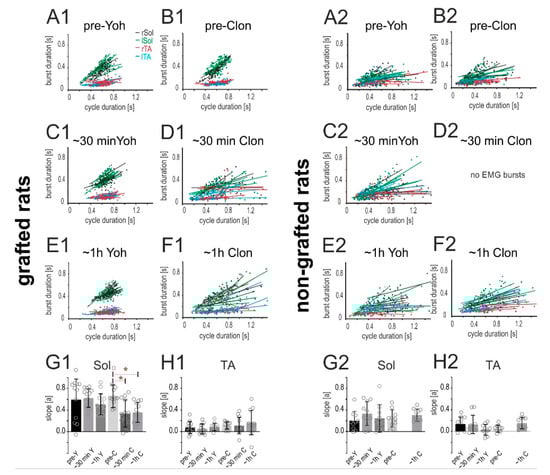 Relationships between burst duration vs. step cycle duration established for the Sol and TA EMG burst activity in both hindlimbs of spinal grafted rats (n = 6) after yohimbine (A1,C1,E1) and clonidine (B1,D1,F1) application as well as in spinal non-grafted rats (n = 5) after yohimbine (A2,C2,E2) and clonidine (B2,D2,F2) application. Each regression line established for the burst EMG activity of a given rat muscle is illustrated by a given color (green/black—left/right Sol; blue/red—left/right TA). The bars in G1, H1, G2, H2 represent the slopes (means ± SD) of regression lines of the relationships between the burst duration vs. step cycle durations for the Sol and TA muscles respectively established for the two groups of rats (with and without a graft) in various experimental conditions, while gray circles present the data from individual rats. Note the locomotor deteriorations after clonidine application are associated with the significant decrease of regression line slopes in the case of Sol (G1) but not TA EMG (H1). RM ANOVA with Tukey’s multiple comparisons * p < 0.05. Abbreviations: Sol: soleus muscle; TA: Tibialis Anterior muscle; l: left; r: right; Clon, C: clonidine; Yoh, Y: yohimbine; ~30 min: < 30 min after drug application; ~1 h: one hour after drug application.