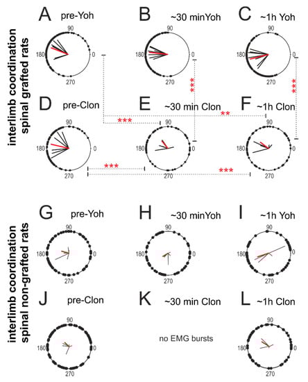 Interlimb coordination in locomotor performance (established between left vs. right TA muscles) in spinal grafted rats (n = 6) after yohimbine (A–C) and clonidine (D–F) application. Interlimb coordination in locomotor performance (established between left vs. right TA muscles) in spinal non-grafted rats (n = 5) after yohimbine (G–I) and clonidine (J–L) application. Black vectors are established for each pair of TA muscles in individual rats. Red vectors are the mean for the group of animals. Single dots in the polar plots illustrate the phase shift between analyzed onsets of EMG burst of left vs. right TA in individual step in all the analyzed animals. RM ANOVA with Tukey’s multiple comparisons ** p < 0.01; *** p < 0.001. Abbreviations: Clon—clonidine; Yoh—yohimbine; ~30 min—< 30 min after drug application; ~1 h—one hour after drug application.