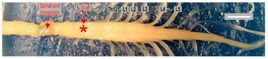 Complete spinal cord transection (SCI) was performed in aseptic conditions under deep anesthesia (Isoflurane, 2% and Butomidor, 0.05 mg/Kg b.w.). First, a mid-dorsal skin incision was performed over the Th8-Th11 vertebrae at the rat back. Next, the back muscles were separated from the vertebral spines. After laminectomy between the Th9/Th10 segments, the spinal cord was completely transected. A piece of spinal cord tissue was gently aspirated after two cuts performed with scissors at a 1–2 mm distance to prevent any axonal regrowth through the cavity of the lesion, as previously described [,,]. After stopping hemorrhage in the lesion cavity, the para-vertebral muscles and fascia were closed in layers using sterile sutures. Then, the skin was closed using stainless-steel surgical clips. After surgery, the animals received a single dose of non-steroidal anti-inflammatory and analgesic treatment (Tolfedine 4 mg/Kg subcutaneously; s.c.) and antibiotics for the following 4 days (Gentamicin 10 mg/Kg s.c.). For about 7 days after spinal cord injury, until the voiding reflex was re-established, the bladder was emptied manually twice a day. Female rats were chosen for these experiments due to relatively fewer problems with the bladder emptying in acute time after spinal cord injury.