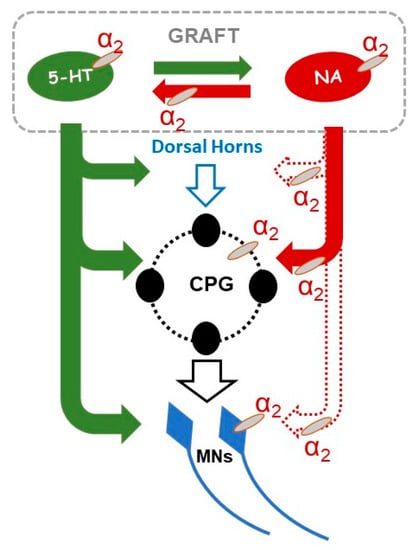 The next possible NA/5-HT actions involved in motor control are indirect pathways involving NA control of 5-HT release [] and pathways involving 5-HT control of NA release [,]. The important elements of indirect pathways controlling hindlimb movement might be related to the reciprocal connections between 5-HT and NA neurons within the graft that in addition to 5-HT receptors (not shown in the figure) are mediated by α2 adrenergic receptors (see Figure 10). The 5-HT fibers present in the ventral horns around the MNs might be a part of indirect pathway of noradrenergic locomotor control re-established by our grafting strategy. As the 5-HT fibers are robust also in the dorsal horns the indirect control of sensory feedback from the hindlimb by NA should be also considered, but further work is required to define the afferents involved in this control.
