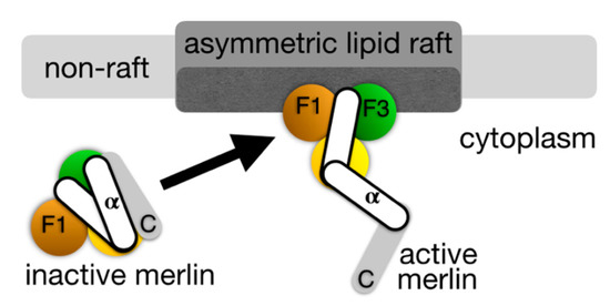 - Stickney, J.T.; Bacon, W.C.; Rojas, M.; Ratner, N.; Ip, W. Activation of the tumor suppressor merlin modulates its interaction with lipid rafts. Cancer Res. 2004, 64, 2717–2724. [Google Scholar] [CrossRef] [PubMed][Green Version]