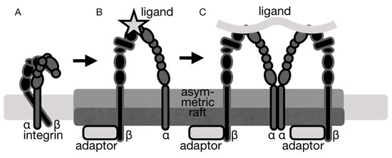 In addition to native ligands, the bilayer asymmetry also influences the sequestration of integrins in raft-mimicking liquid mixtures [123,124]. The bilayer asymmetry dependency during integrin sequestration demonstrates the significance in the different lipid packing and bilayer thickness between liquid-ordered and liquid-disordered domains. As discussed above, cholesterol might regulate integrin distribution by changing the bilayer thickness and lipid packing densities in liquid-ordered and liquid-disordered domains. The cholesterol-mediated integrin sequestration is due to the bilayer thickness of coexisting liquid-ordered and liquid-disordered domains, whereby cholesterol might regulate the distribution of integrin αVβ3 by altering the bilayer thickness and lipid packing densities of the liquid-disordered and liquid-ordered domains [113].