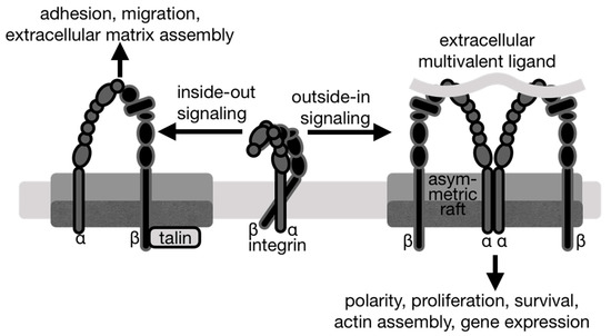 In contrast, during traditional outside-in signaling, extracellular ligands bind to integrins, causing a conformational change and integrin clustering due to the multivalent nature of the ligands. Both inside-out and outside-in signaling lead to the regulation of cell polarity, cell survival, and cell proliferation, as well as gene expression and the remodeling of the actin cytoskeleton [77]. There are several proteins that interact with integrins within lipid rafts and an important question remains, how mechanistically lipid rafts affect these processes.
