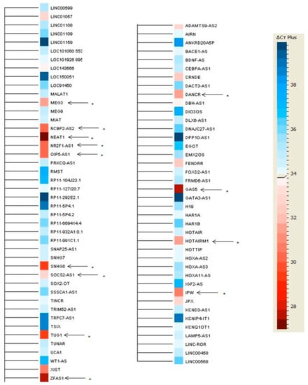 Long non-coding RNAs (LncRNAs) significantly present in human enteric precursor cells (EPCs). Representative heat map of the qRT-PCR experiments in human EPCs. The heat map shows the positive (red) or negative (blue) expression levels of lncRNA in human EPCs. Arrow and asterisk indicate the 13 lncRNA with a statistically significant presence. The color scale represents the ΔCt plus, shown on the right side. Cycle threshold (Ct) = 34.