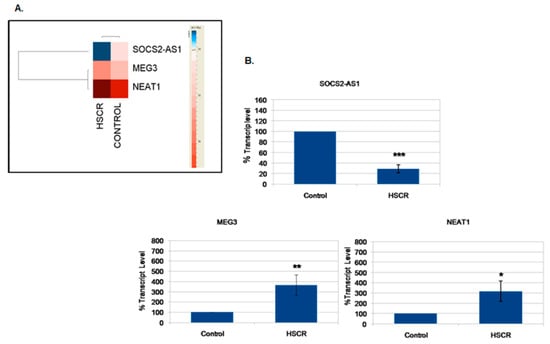 LncRNAs with different transcript levels in Hirschsprung disease enteric precursor cells (HSCR-EPCs). (A) The Heat map represents the differential transcript levels of the lncRNA in HSCR-EPCs, the upregulation (red) and downregulation (blue) are shown. The color scale indicates the ΔCt plus, shown on the right side. Ct = 34. (B) Graphics show the percentages of transcript level of each lncRNA (SOC2-AS1, MEG3 and NEAT1) in EPCs from HSCR patients and controls. * p value < 0.05, ** p value < 0.01 and *** p value < 0.001.