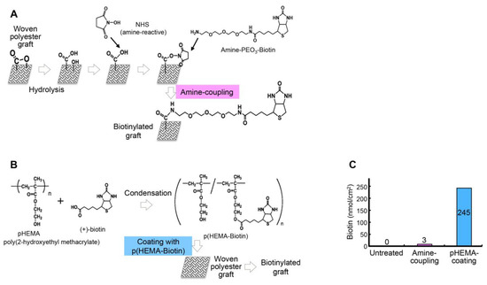 Development of the biotinylated graft. (A) Schematic diagram illustrates the preparation of the biotinylated graft with an amine-coupling reaction. (B) Schematic diagram illustrates the preparation of the biotinylated graft by coating with poly (2-hydroxyethyl methacrylate) (pHEMA). (C) Quantification of the amounts of biotin on the graft surfaces.