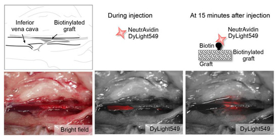 Shortly thereafter, DyLight549-labeled neutravidin (Pierce) was injected through the iliac vein. The fluorescent signal was visualized with a fluorescence stereomicroscope (MVX10, Olympus, Tokyo, Japan) in real time. During the fluorescence-labeled neutravidin injection, successful reestablishment of the blood flow was confirmed when the fluorescent signal passed through the inferior vena cava. The interaction between biotin and neutravidin was considered successful when the fluorescent signal accumulated in the biotinylated graft.