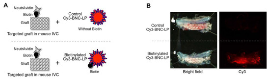 Next, we checked the binding of the biotinylated BNC-LP complex to the targeted graft, in vitro. The targeted graft was prepared by allowing DyLight488-labeled neutravidin to bind to the biotin attached to the graft (Figure 4D). Then, we demonstrated that the Cy3-labeled biotinylated BNC-LP complex could specifically bind to the neutravidin attached to the targeted graft in vitro (Figure 4D,E).