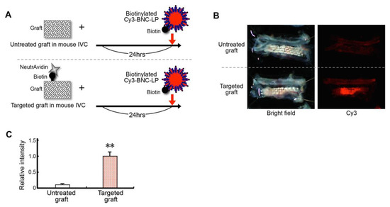 Next, we examined how efficiently the target-recognizing BNC-LP complex could be loaded onto the targeted graft. Here, we placed either the targeted graft or an untreated graft into the mouse inferior vena cava. The next day, we injected the biotinylated BNC-LP complex labeled with Cy3 intravenously. At 60 min after injection, the grafts were excised, and we examined the Cy3 fluorescence intensities (Figure 6A).