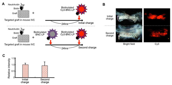 Next, we examined the capacity of the targeted graft to be recharged with the target-recognizing BNC-LP complex. We placed the targeted graft into the mouse inferior vena cava. For this recharging experiment, we first intravenously injected a biotinylated BNC-LP complex without the Cy3 label, on the same day of graft placement (Figure 7A). Then, 24 h later, we injected another dose of the biotinylated BNC-LP complex, but this dose was labeled with Cy3. As a control experiment, at 24 h after graft placement, a single intravenous injection of the biotinylated BNC-LP complex labeled with Cy3 was performed. The grafts were excised at about 24 h after graft placement, and the Cy3 fluorescence intensities of the grafts were examined.