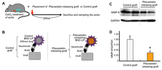Effect of releasing drug from the graft charged with BNC-LP complexes on mouse aortic tissues. (A) Schematic diagram of the experimental design: CaCl2 induces inflammation in the aorta (red); the pitavastatin-releasing graft or the control graft is placed next to the aorta. (B) Schematic diagram of the experiment: the pitavastatin-releasing graft is compared to the control graft. (C) Representative images of western blots for estimating the expression of matrix metalloproteinase-9 (MMP-9) relative to glyceraldehyde 3-phosphate dehydrogenase (GAPDH) expression (internal loading control). (D) Quantification of MMP-9 expression in mouse aortic tissues. Data are the means ± standard deviations of 5 independent observations. * p < 0.05 compared to the control.