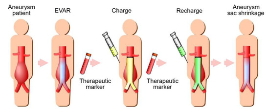 Schematic diagram of future directions for the novel hybrid drug delivery system. The system would enable the delivery of suitable drugs at aneurysms, based on a therapeutic marker when necessary. This system could serve as an adjuvant therapy to improve the long-term outcome of endovascular aneurysm repair (EVAR).