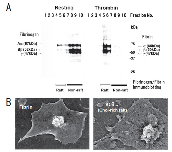 We have been identifying glycosphingolipid-binding proteins [13,14,15,16,17,18,19] and investigated the signal transduction in lipid rafts of platelets [20]. Previously, we reported that clot retraction is mediated by the coagulation factor XIII (FXIII)-dependent fibrin-integrin αIIbβ3-myosin axis in platelet sphingomyelin (SM)-rich membrane rafts [21]. Clot retraction is a process driven by outside-in signaling by the platelet integrin αIIbβ3, resulting in the contraction of the fibrin mesh and the formation of mechanically stable thrombi. To elucidate the function of platelet lipid rafts, we identified DRM-raft-specific proteins from activated platelets. We isolated the DRM raft fraction of platelets treated with thrombin by sucrose gradient centrifugation. Several specific proteins were present in the DRM fraction of thrombin-stimulated platelets. By mass spectrometry, we identified three proteins of 65, 50, and 47 kDa as fibrins α, β, and γ, respectively. These findings were supported by the results of immunoblot analysis using an anti-fibrinogen/fibrin polyclonal antibody. In resting platelets, fibrinogens Aα (67 kDa), Bβ (52 kDa), and γ (47 kDa) were present in the non-raft fraction. In contrast, fibrins α (65 kDa), β (50 kDa), and γ (47 kDa) were exclusively present in the DRM fraction of platelets treated with thrombin (Figure 1A) [21]. Therefore, we investigated the subcellular distribution of fibrin and BCθ-positive cholesterol-rich rafts on thrombin-stimulated spreading platelets by scanning immunoelectron microscopy. Fibrin was localized in the central area of spreading platelet (Figure 1B, left panel). In contrast, BCθ-positive cholesterol-rich rafts were localized evenly on the membrane (Figure 1B, right panel). These observations suggest that fibrin is translocated to platelet rafts other than cholesterol-rich rafts following thrombin stimulation.