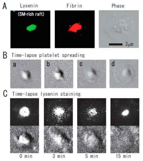 Lysenin, the earthworm toxin, is a specific probe of sphingomyelin (SM)-rich rafts in living cells [22,23]. SM is a major component of raft lipids in platelets [9]. Therefore, we investigated the subcellular distribution of SM-rich rafts in spreading platelets. Lysenin-positive SM-rich rafts were localized in the central area of adhering platelets stimulated with thrombin (Figure 2A, left panel). Lysenin-positive SM-rich rafts and fibrin mostly colocalized as a patch in the double-stained the central area of spreading platelets stimulated with thrombin (Figure 2A, middle panel). Next, we investigated the spreading of platelets by time-lapse differential interference contrast (DIC) imaging (Figure 2B) and lysenin staining (Figure 2C). In resting platelets (Figure 2C, 0 min), lysenin-positive SM-rich rafts were uniformly distributed on the cell surface. At an early stage of the spreading of platelets treated with thrombin for 3 min, SM-rich rafts were mainly localized in the central area of adhering platelets with some distributed in the lamellipodia. At a late stage of spreading of platelets treated with thrombin for 15 min, almost all SM-rich rafts were in the central area. Furthermore, we also demonstrated the translocation of myosin to the DRM raft fraction following thrombin stimulation and the colocalization of activated myosin with fibrin in SM-rich rafts of adhering platelets stimulated with thrombin [21]. These observations suggest that SM-rich rafts act as platforms of fibrin-mediated outside-in signaling, leading to clot retraction. To support this idea, the clot retraction of SM-depleted platelets from SM synthase 1 and SM synthase 2 knockout mice was delayed significantly. As a result, we demonstrated that fibrin converted by thrombin translocates immediately into platelet DRM rafts in a coagulation factor XIII (FXIII)-dependent manner. Therefore, we proposed that fibrin is translocated to SM-rich rafts in the presence of FXIII crosslinking activity and that platelet SM-rich rafts act as platforms where extracellular fibrin and intracellular actomyosin join to promote clot retraction [21,24,25]. A spatial distinction between SM-rich rafts and cholesterol-rich rafts in platelets is illustrated (Figure 3).