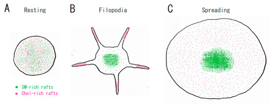 A spatial distinction between SM-rich rafts and cholesterol-rich rafts in platelets. (A) In resting platelets, SM-rich rafts (green) and cholesterol-rich rafts (red) are uniformly distributed on the cell surface. No spatial distinction is observed by confocal microscopy. (B) Cholesterol-rich rafts accumulate at the tips of filopodia of adhering platelets [12]. SM-rich rafts are mainly localized in the central area of adhering platelets with some distributed in the lamellipodia. (C) SM-rich rafts are in the central area of full spreading platelets. Cholesterol-rich rafts were localized evenly on the membrane [21].