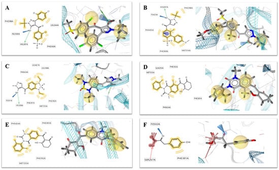 Six crystallographic structures of HPPD protein were collected from the RCSB PDB database (PDB ID: 1TG5, 1TFZ, 5YWH, 5YWK, 5YY6 and 5XGK). The interaction between the HPPD protein and potential ligands was calculated using LS. Although these models have similar chemical characteristics, they all describe slightly different interaction patterns that may occur within the HPPD binding site. For example, both the 1TG5 and 1TFZ models contain a hydrogen bond (green) effect with HIS287 and a hydrophobic (yellow) effect with Phe398 and Phe360, but the 1TFZ model has one more aromatic ring effect (blue) than the 1TG5 model, the same as 5YY6. Among the amino acids in the 5YWK and 5YWH models, Phe424, Phe381, Phe392 and Met335 all produced hydrophobic groups (yellow), but the amino acid His308 in 5YWH produced hydrogen bonds (green) as shown in Figure 2.