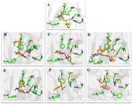 Receptor–ligand interaction of (A) benquitrione, (B) ZINC000049180836 (C) ZINC000040310216, (D) ZINC000003830381, (E) ZINC000035458722, (F) ZINC000012663485 and (G) ZINC000002032320 with the HPPD active site.