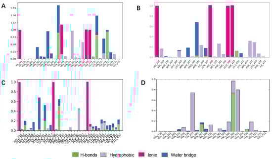 Bar charts of protein–ligand (P–L) contacts. (A) ZINC000049180836 (B) ZINC000040310216, (C) ZINC000003830381, (D) ZINC000002032320. Abscissa represents the amino acid number. Ordinate represents interactions fraction.