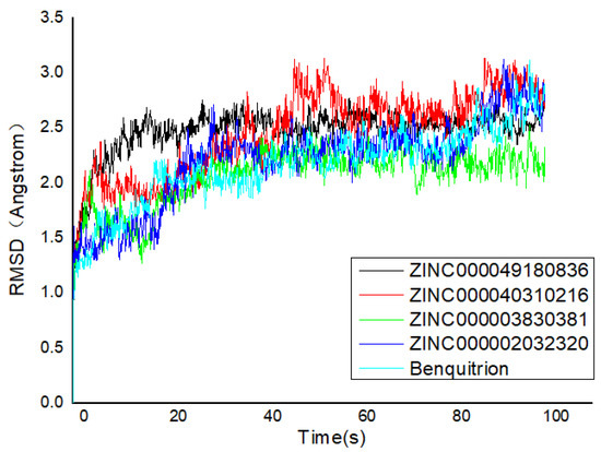 MM/GBSA is a molecular mechanics of binding energy, solvation model, nonpolar solvation term, nonpolar solvent accessible surface area and van der Waals interaction method to define the free energy of binding [35]. MM/GBSA was applied to calculate the binding free energy of the ligand-receptor complexes taking thermodynamic and desolvation parameters into consideration. The ΔGbind, ΔGbind coulomb, ΔGbind Hbond, ΔGbind lipo and ΔGbind vdW parameters involved in the calculation are shown in Table 2. The Glide energy required for compound ZINC00004910836 is the smallest, which was consistent with the previous molecular docking results. Among the calculated parameters of compound ZINC00004910836, the ΔGbind value was 55.129 kcal/mol, the ΔGbind coulomb value was −48.956 kcal/ mol, the ΔGbind Hbond was −0.530 kcal/mol, nonpolar solvation (ΔGbind lipo) value was −26.162 kcal/mol and van der Waals (ΔGbind vdW) value was −41.324 kcal/mol. From the parameters calculated for each compound, it could be easily concluded that ΔG bind coulomb and ΔG bind vdW were the main contributors to the binding free energy of compounds. Noticeably, it was also detected that ΔG covalent, providing unfavorable energy, was negative to the binding of protein.